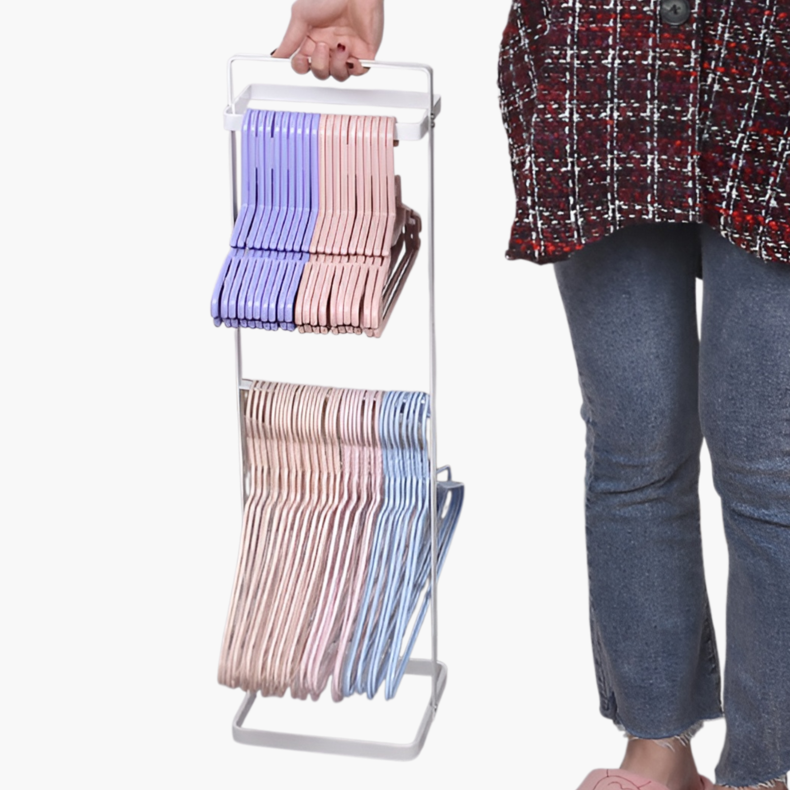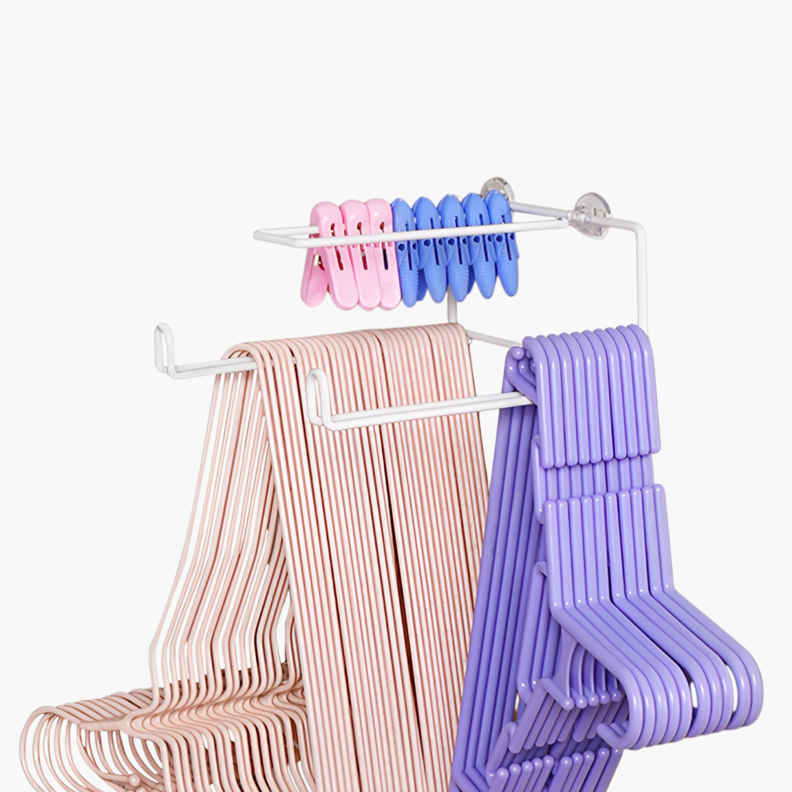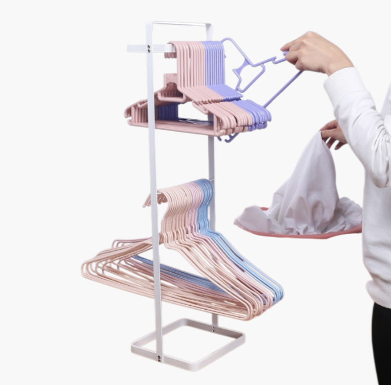 Space-saving clothes hanger storage rack, durable metal construction, easy wall-mount installation, keeps hangers organized and accessible, suitable for home and laundry room use.